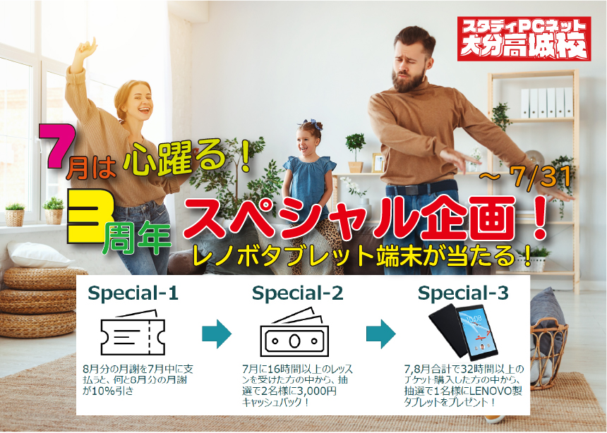 開催期間は7/31(金)までとなっていますので、みなさん早めにスタディPCネット大分高城校へいらしてくださいね!